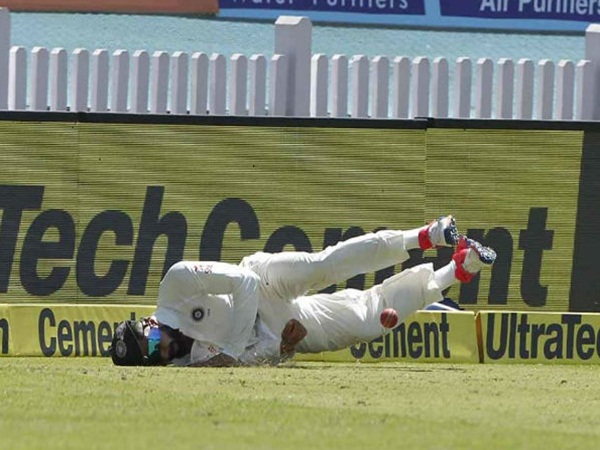 ஆட்டத்தின் 40-வது ஓவரை ஜடேஜா வீசினார். இந்த ஓவரின் முதல் பந்தை ஹேண்ட்ஸ்காம்ப் வேகமாக அடித்தார். பந்து பௌண்டரிக்கு செல்லாமல் பாய்ந்து தடுத்தார் கோஹ்லி. அப்போது அவரது வலது தோள்பட்டை தரையில் பலமாக தாக்கியது.