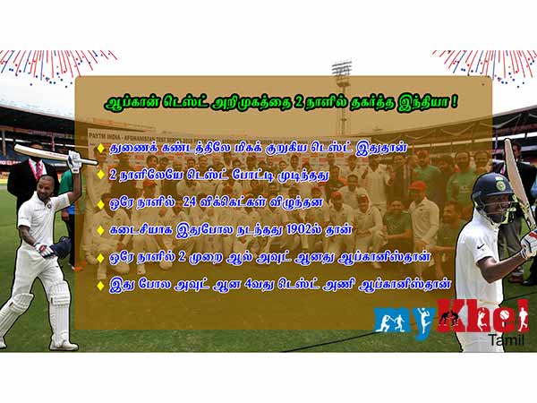 இந்தியத் துணைக் கண்டத்தில் நடந்து முடிந்த மிகக் குறுகிய டெஸ்ட் போட்டி இதுதான். 2 நாளிலேயே போட்டி முடிந்து போனது. ஒரே நாளில் 24 விக்கெட்கள் சாய்ந்தன. இதற்கு முன்பு இதுபோல 1902ல் நடந்துள்ளது. ஒரே நாளில் இருமுறை ஆல் அவுட் ஆன 4வது அணியாகவும் ஆப்கானிஸ்தான் உருவெடுத்தது.