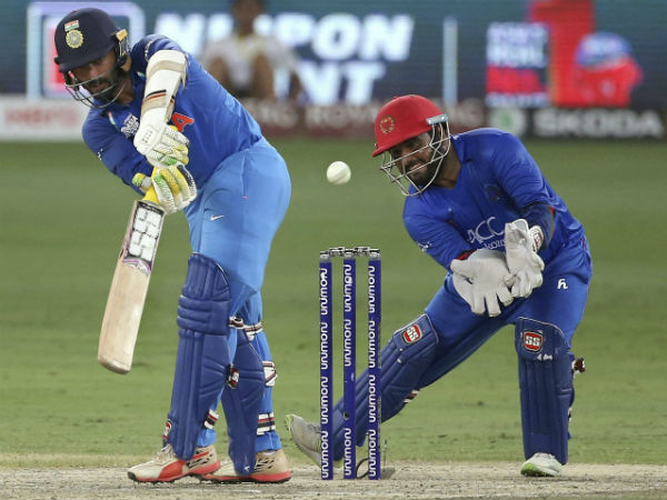 253 ரன்கள் இலக்கை நோக்கி ஆடத் துவங்கிய இந்திய அணிக்கு ராகுல், அம்பதி ராயுடு முதல் விக்கெட்டுக்கு 110 ரன்கள் சேர்த்து அசத்தல் துவக்கம் அளித்தனர். ராயுடு அதிரடியாக ஆடி 4 சிக்சர்கள், 4 பவுண்டரிகள் அடித்து, 57 ரன்களில் ஆட்டமிழந்தார். அடுத்து ராகுல் 60 ரன்களில் ரஷித் கான் பந்தில் வெளியேறினார். தோனி, தினேஷ் கார்த்திக் இருவரும் அம்பயர் கொடுத்த தவறான LBW முடிவால் வெளியேறினர். இருந்த ஒரே ரிவ்யூவை ராகுல் பயன்படுத்தி விட்டதால் இவர்களுக்கு ரிவ்யூ செய்யும் வாய்ப்பும் கிடைக்கவில்லை. மனிஷ் பாண்டே 8, ஜாதவ் 19 ரன்களிலும், தீபக் சாஹர் 12, கவுல் 0, குல்தீப் 9 ரன்களிலும் வெளியேற இந்தியா தடுமாறியது. ஆப்கன் அணி பந்துவீச்சில் ஆதிக்கம் செலுத்தியது.