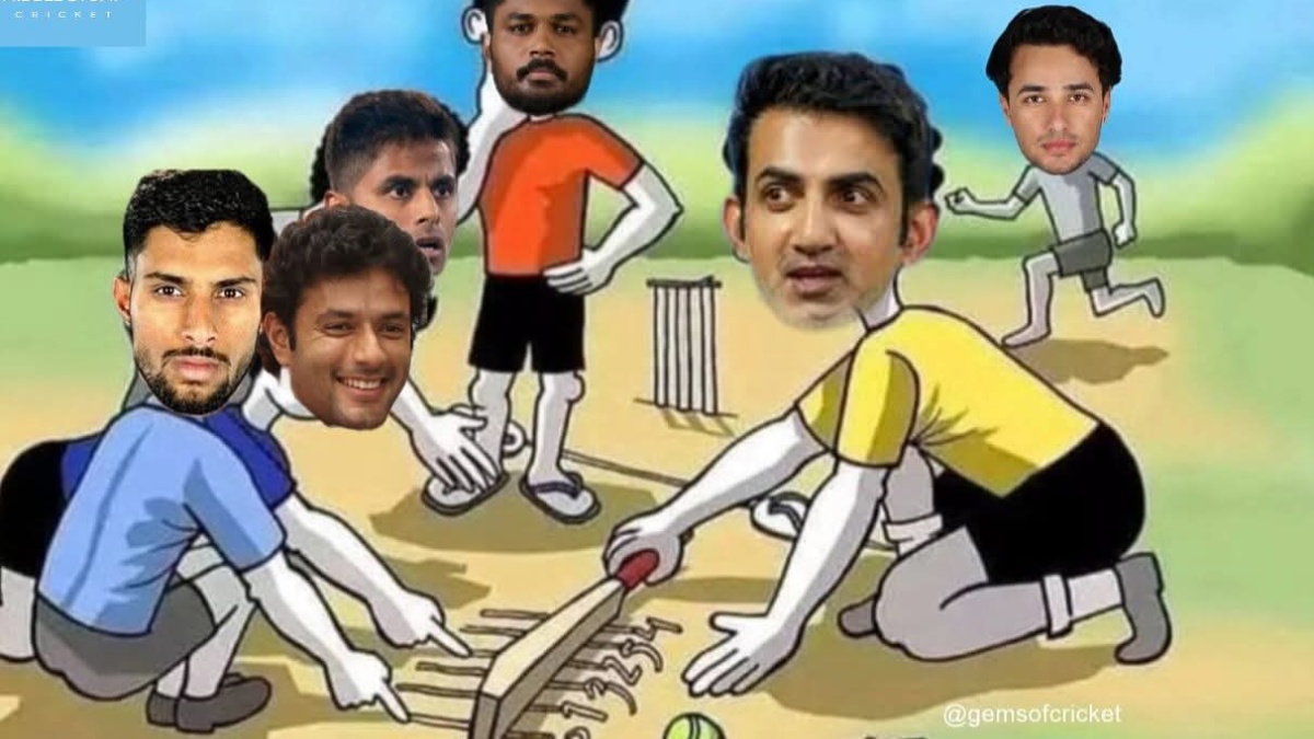 யார் யாரோ வந்து சென்றார்கள். இதனால் ஐந்தாவது இடத்தில் பேட்டிங் செய்ய இருந்த சாம்சன் கடைசிவரை வரவே இல்லை. இதனை கிண்டல் செய்யும் விதமாக கௌதம் கம்பீர் பேட்டிங் வரிசையை இப்படித்தான் தேர்வு செய்கிறார் என்று மீம்ஸ் போட்டு ரசிகர்கள் கிண்டல் செய்திருக்கின்றனர். அதாவது 90 கிட்ஸ் தெருவில் கிரிக்கெட் விளையாடும் போது பேட்டிங் வரிசையில் தேர்வு செய்வதற்காக மணலில் நம்பர் போட்டு கோடு போட்டு இருப்பார்கள்.