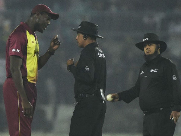 ஆனால், ரீப்ளேவில் அது நோ பால் இல்லை என தெரிந்தது. அதை கண்டு கோபம் அடைந்த வெஸ்ட் இண்டீஸ் கேப்டன் கார்லோஸ் பிராத்வைட் அம்பயர்களை முடிவை மாற்றுமாறு கூறினார். ஆனால், அதற்கு அம்பயர்கள் மறுக்கவே நீண்ட நேரம் போட்டி தடை பட்டு களத்தில் விவாதம் அரங்கேறியது.