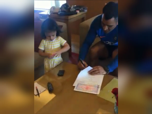 இந்த வீடியோவில் டோணி, அணிக்குத் திரும்புவது தொடர்பான ஒப்பந்தத்தில் கையெழுத்திடுகிறார். அப்போது அவரது மகள் ஜிவா அருகில் நின்று கொண்டிருக்கிறார். பேனாவை எடுத்து விளையாடியபடி இருக்கிறது இந்த குட்டிப் பாப்பா.