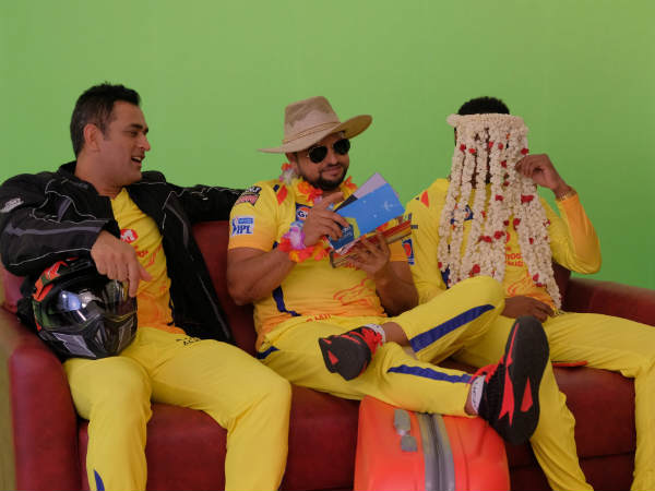 ஒரு சோபாவில் தோனி, ரெய்னா ஆகியோர் உட்கார்ந்திருக்கின்றனர். அணியின் டிரெஸ்சோடு தோனி ஒரு ஓவர்கோட் போட்டுக் கொண்டு கையில் ஹெல்மெட்டுடன் இருக்கிறார்.