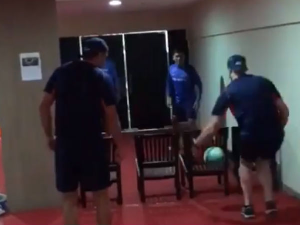 அந்த மைதானத்தில் இருக்கும் உள்விளையாட்டு அரங்கில் நியூசிலாந்து அணி வீரர்களுடன் அவர் எந்தக் கவலையும் இன்றி விளையாடி இருக்கிறார். மேலும் வாலிபாலுக்கு இடையில் கட்டியிருக்கும் வலை இல்லாததால் அதற்கு பதிலாக நாற்காலியை தடுப்பாக உபயோகித்து இருக்கின்றனர்.