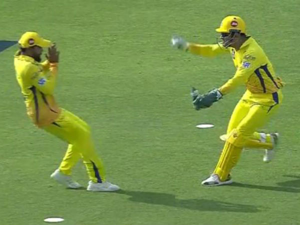 பந்தை கையில் எடுத்த தோனி, ஜடேஜா மீது எறிவதுபோல் சைகை செய்தார். உண்மையாகவே பந்தை எறிகிறார் என்று ஜடேஜா ஒதுங்கினார்.