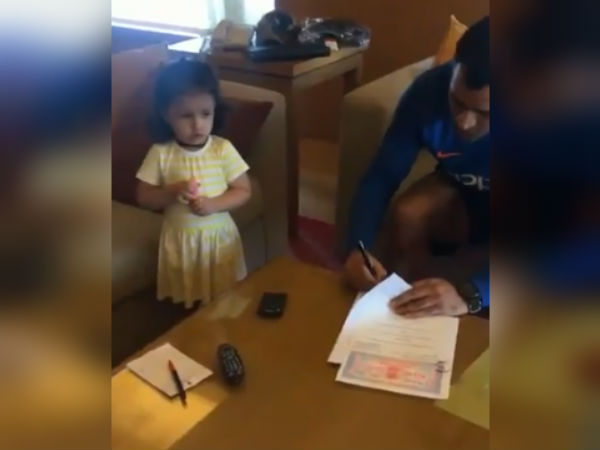 இதில் டோணி கையெழுத்திடும் போது அவரது மகளி ஸிவா, அப்பாவை எந்த தொந்தரவும் செய்யாமல் சமத்தாக அருகில் ஏதையோ கையில் வைத்து விளையாடிக் கொண்டிருக்கிறார்.