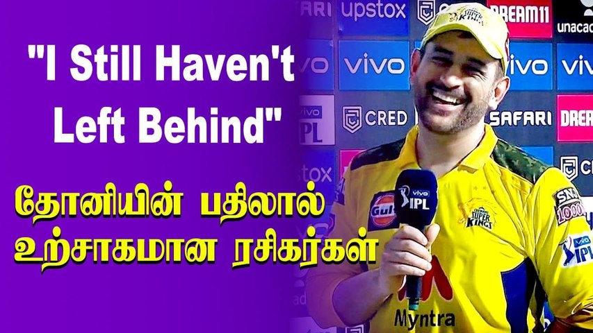 தொடர்ந்து கேள்வி எழுப்பிய ஹர்ஷா போக்லே, தோனியை நோக்கி ஒரு பெரிய இடத்தில் ஜாம்பவான் அணியாக சி.எஸ்.கே அணியை விட்டு செல்கிறார் என்று கூறினார். உடனே தோனி சிரித்தபடி இன்னும் சென்னை அணியில்தான் இருக்கிறேன் எங்கும் போகவில்லை என்று தோனி சிரித்தபடி அந்தப் பேட்டியை முடித்து வெளியேறினார். இதனால் தோனி அடுத்தாண்டு ஐபிஎல் தொடரில் கண்டிப்பாக இருப்பார் என்பது உறுதியாகியுள்ளது.