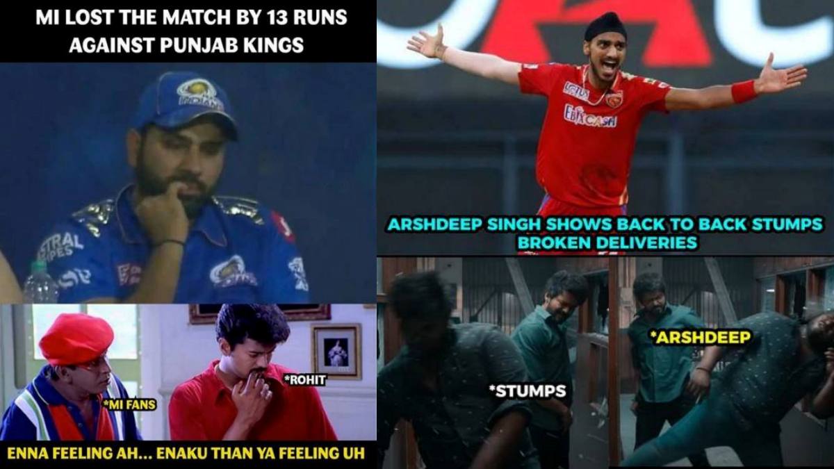 அதேபோல், கடைசி ஓவரில் பஞ்சாப் அணியின் அர்ஷ்தீப் சிங் திலக் வர்மா மற்றும் நேஹல் வதேரா விக்கெட்டை ஸ்டம்புகளை உடைத்து கைப்பற்றினார். இதனை மாஸ்டர் படத்தில் வரும் விஜயின் இடைவேளை சண்டைக் காட்சியில் கண்ணாடிகள் சிதறடிக்கப்படும் காட்சியோடு ஒப்பிட்டு உருவாக்கப்பட்டுள்ள மீம் வேற லெவல்.