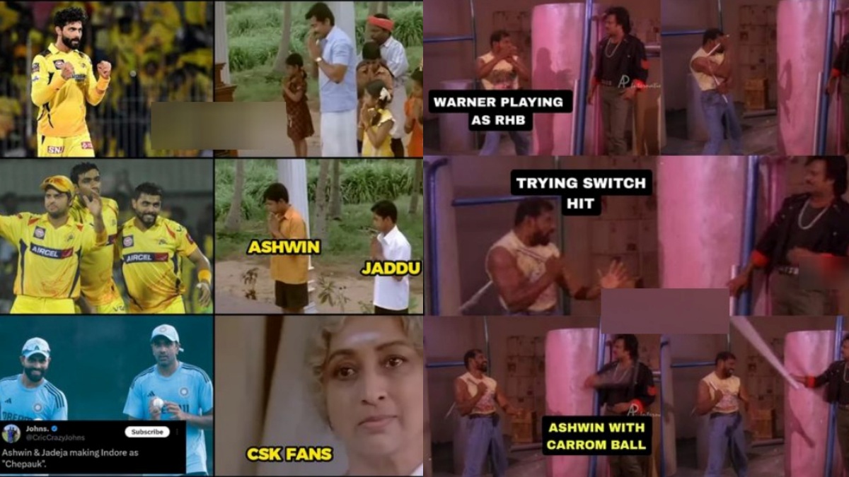 இந்திய அணியின் அஸ்வினை சமாளிக்க ஆஸி. வீரர் டேவிட் வார்னர் வலது கை பேட்ஸ்மேன், ஸ்விட்ச் ஹிட் என்று வித்தியாசமான முயற்சிகளை மேற்கொண்டார். ஆனால் அஸ்வின் வழக்கம் போல் கேரம் பாலை வீசி வார்னரை முடித்து கட்டினார். அதனை ரஜினி முன் பல்வேறு வித்தைகளை செய்யும் அடியாள் ஒருவரை தலையில் ஒரே அடியாக அடித்து வீழ்த்துவதை போல் அஸ்வினை வார்னரை வீழ்த்தியதாக உருவாக்கப்பட்டுள்ள மீம் குபீர் ரகம்.
