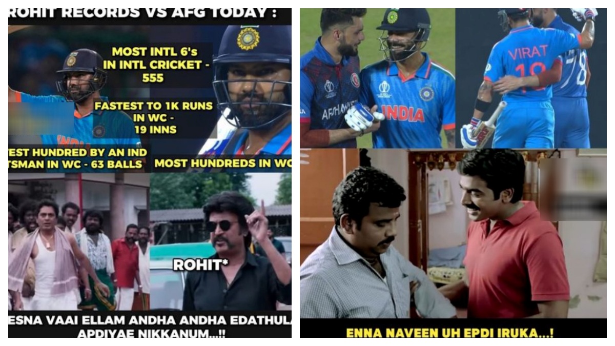 நேற்றைய ஆட்டத்தில் சர்வதேச கிரிக்கெட்டில் அதிக சிக்ஸ், உலகக்கோப்பையில் அதிக சதம், உலகக்கோப்பை அதிக வேக சதமடித்த இந்திய வீரர், உலகக்கோப்பையில் அதிவேகமாக ஆயிரம் ரன்கள் சேர்த்த வீரர் என்ற ஏராளமான சாதனைகளை ரோகித் சர்மா படைத்தார். இதனை பேட்ட படத்தின் ரஜினியாக ரோகித் சர்மா, "பேசுன வாயெல்லாம் அந்தந்த இடத்துல அப்படியே நிக்கனும்" என்று சொல்வதாக உருவாக்கப்பட்டுள்ள மீம் மரண மாஸ்.