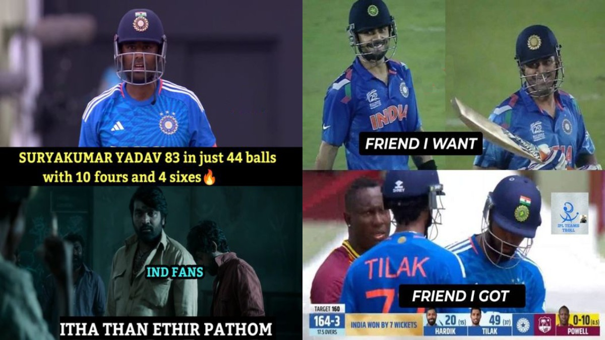 குயானா: வெஸ்ட் இண்டீஸ் அணிக்கு எதிரான 3வது டி20 போட்டியில் இந்திய அணி அபார வெற்றிபெற்றுள்ள நிலையில், ஆட்டத்தின் சுவாரஸ்யங்களை வைத்து ரசிகர்கள் உருவாக்கிய மீம்ஸை பார்க்கலாம்.