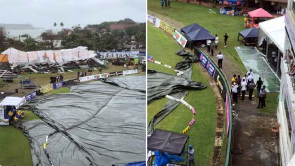 இந்நிலையில் மைதானத்தின் ஒருபகுதி சரிந்து விழுந்தது பரபரப்பை ஏற்படுத்தியுள்ளது. மைதானத்தின் ஒருபுறத்தில், சிறிய ஸ்டாண்ட் ஒன்று ஏற்பாடு செய்யப்பட்டிருந்தது. அதிவேகமாக அடித்த காற்றால், அந்த ஸ்டாண்ட்டின் மேற்கூரை இடிந்து விழுந்தது. அங்கு யாரும் இல்லாததால் உயிர் சேதத்தை தவிர்த்து விட்டனர்.