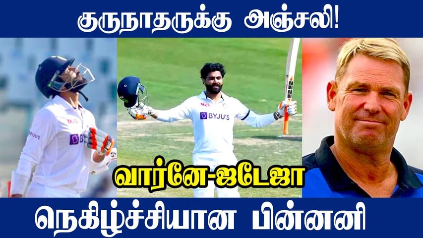 இன்று இலங்கை டெஸ்ட் போட்டியின் போது ஜடேஜா 100 ரன்களை கடந்து வெற்றிகரமாக ஓடிக் கொண்டிருக்கிறார். தன்னுடைய மென்டார் மறைவுக்கு மரியாதை செலுத்தும் விதமாக இந்த சதம் அமைந்துள்ளது. குருவுக்கு சிஷ்யனின் காணிக்கையாக ஒரு இளம் வீரரைக் கண்டறிந்து நன்றாக வருவார் என்று அன்றே கணித்த ஷேன் வார்னே தன் கணிப்பு பொய்யில்லை என்பதை நிரூபிக்கும் விதமாக ஜடேஜாவின் ஆட்டம் அமைந்துள்ளது என்றால் மிகையாகாது.