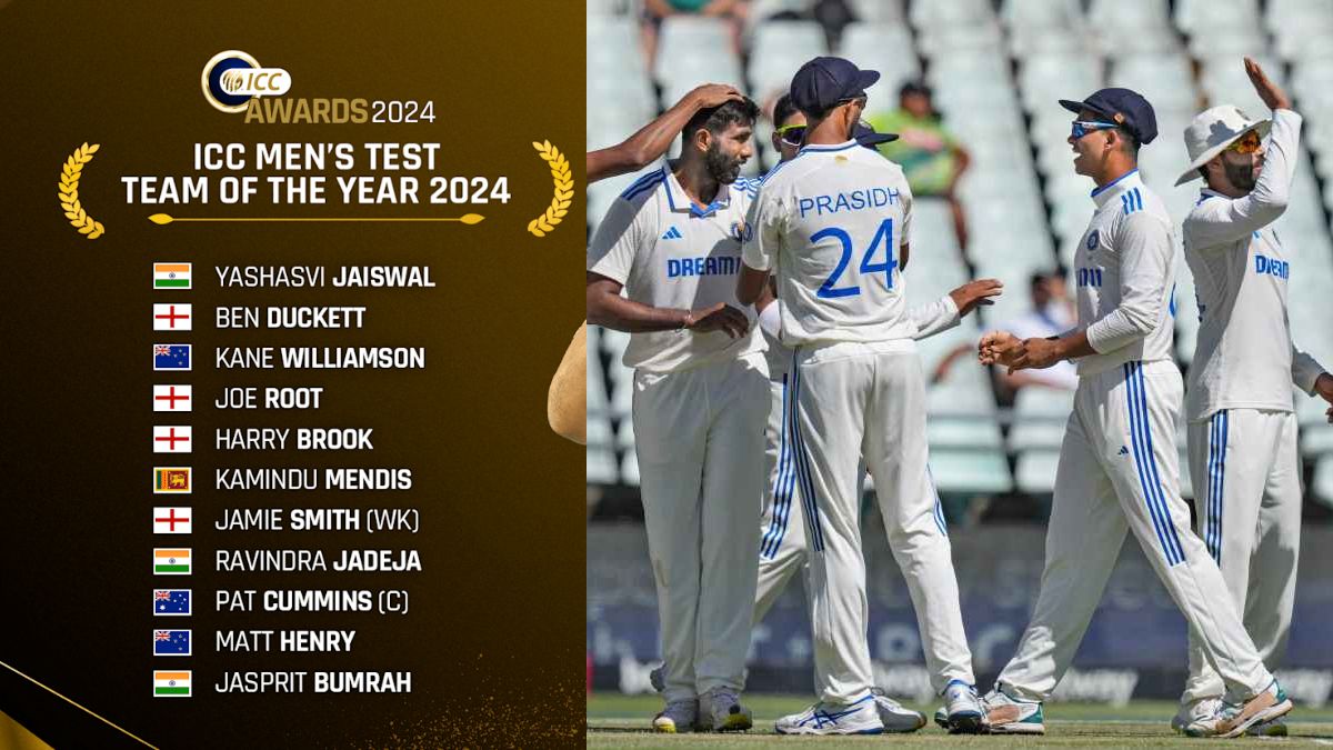 துவக்க வீரர் யாஷஸ்வி ஜெய்ஸ்வால், சுழற் பந்துவீச்சு ஆல் ரவுண்டர் ரவீந்திர ஜடேஜா, உலகின் முன்னணி வேகப் பந்துவீச்சாளர் ஜஸ்ப்ரீத் பும்ரா ஆகிய மூன்று இந்திய வீரர்களுக்கு 2024 ஆம் ஆண்டிற்கான சிறந்த டெஸ்ட் பிளேயிங் லெவனில் இடம் அளிக்கப்பட்டு இருக்கிறது.