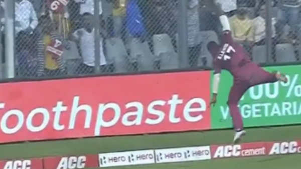 பந்தை ஒற்றைக் கையில் பிடித்த அவர், அப்படியே பந்தை உள்ளே வீசி விட்டு, பவுண்டரி எல்லையை தாண்டி, விளம்பர பலகைகள் மேல் விழுந்தார். இதன் மூலம், ரோஹித் அவுட் ஆகும் வாய்ப்பில் நூலிழையில் தப்பினார்.