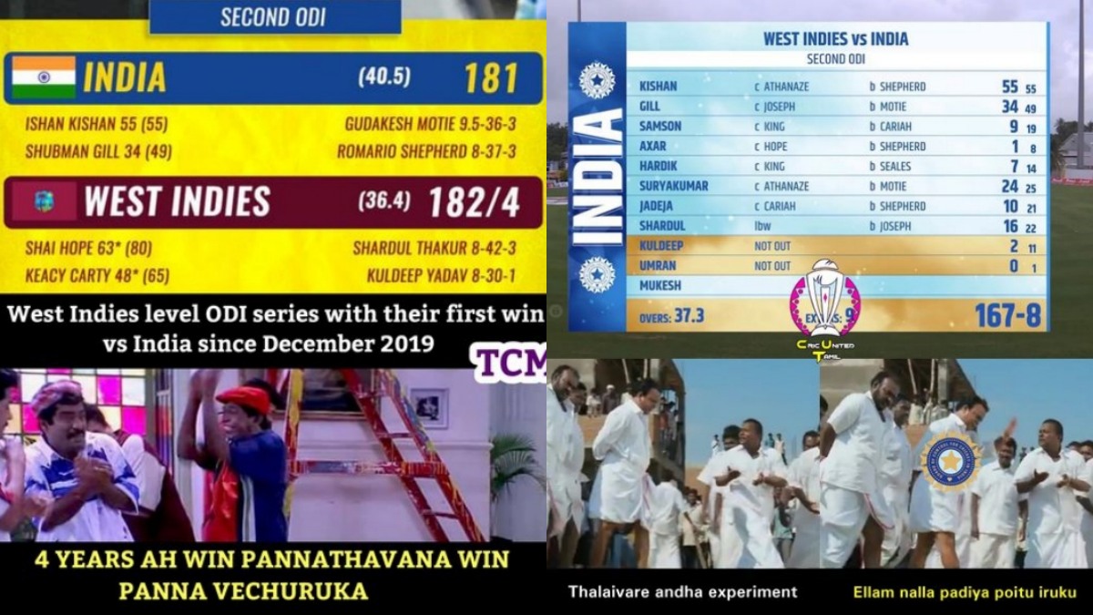 இந்தியாவுக்கு எதிரான 2வது ஒருநாள் போட்டியில் வெஸ்ட் இண்டீஸ் 6 விக்கெட்டுகள் வித்தியாசத்தில் வெற்றிபெற்றுள்ளது. இதன் மூலம் 2019ஆம் ஆண்டுக்கு பின் முதல்முறையாக வெஸ்ட் இண்டீஸ் அணி இந்தியாவை வீழ்த்தியுள்ளது. இதனை பிரெண்ட்ஸ் படத்தில் வரும் வடிவேலு, "என் உசுற வாங்குறதுக்குனே வந்திருக்கீங்க டா" என்று சொல்லுவார். அதனை மாற்றி, "4 வருஷமா ஜெயிக்காதவன போய் ஜெயிக்க வச்சிருக்க" என்று ரசிகர்கள் புலம்புவது போல் உருவாக்கப்பட்டுள்ள மீம் வேற லெவல்.