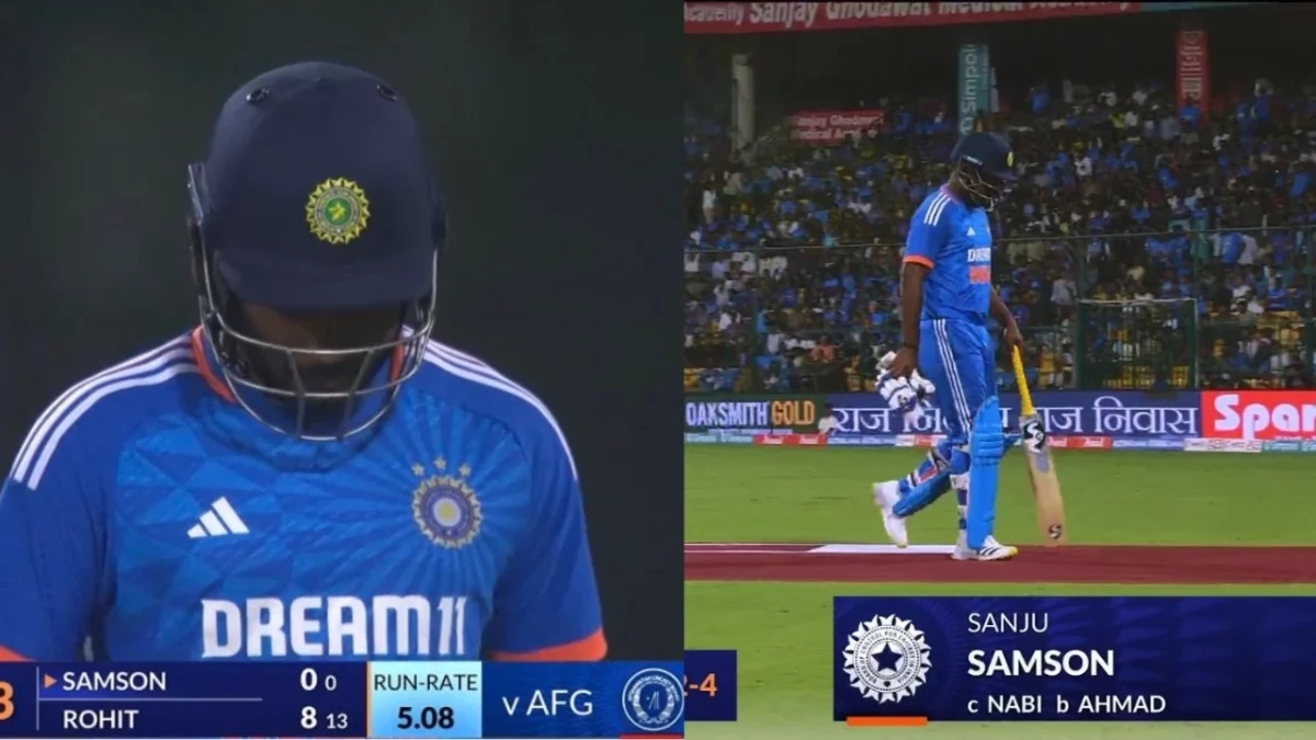 இந்திய அணி மூன்று விக்கெட்டுகளை இழந்து தடுமாறிய நிலையில் சஞ்சு சாம்சன் இன்றைய ஆட்டத்தில் பெரிய ஸ்கோர் அடித்து தன்னுடைய இடத்தை உறுதி செய்து கொள்வார் என்று ரசிகர்கள் மிகவும் எதிர்பார்த்தனர். ஆனால் அவர் தாம் எதிர்கொண்ட முதல் பந்திலே முகமது நபியிடம் கேட்ச் ஆகி கோல்டன் டக் ஆனார். இதன் மூலம் இந்திய அணி 22 ரன்கள் சேர்ப்பதற்குள் நான்கு விக்கெட்டுகளை இழந்து தடுமாறியது.