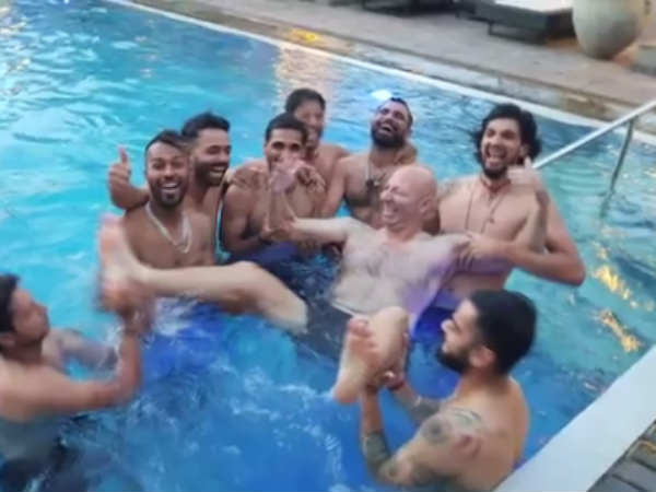 மேலும் கடுமையான பயிற்சியில் ஈடுப்பட்ட வீரர்கள் புத்துணர்ச்சியாக இருக்க நேற்று நீச்சலும் அடித்து இருக்கின்றனர். சாதாரணமாக நீச்சல் அடிக்காமல், ஒருவருக்கு ஒருவர் சண்டையிட்டு ஜாலியாக விளையாடி இருக்கின்றனர். மேலும் இதைப்பற்றி புகைப்படங்களுக்கு பதில் வீடியோவே வெளியிட்டு இருக்கிறது பிசிசிஐ.