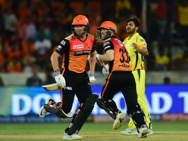 கேப்டன் கேன் வில்லியம்சன் 3, விஜய் ஷங்கர் 7, தீபக் ஹூடா 13 ரன்கள் சேர்த்து ஆட்டமிழந்தனர். எனினும், இலக்கு சிறியது என்பதால், இந்த விக்கெட் வீழ்ச்சி அந்த அணியை பாதிக்கவில்லை. துவக்க வீரர் பேர்ஸ்டோ கடைசி வரை ஆட்டமிழக்காமல் நின்று 61 ரன்கள் சேர்த்து அணியை வெற்றி பெற வைத்தார். 16.5 ஓவர்களில் வெற்றி இலக்கை தாண்டியது ஹைதராபாத். சென்னை அணியில் இம்ரான் தாஹிர், ஜடேஜா மட்டுமே சிறப்பாக பந்துவீசினர்.