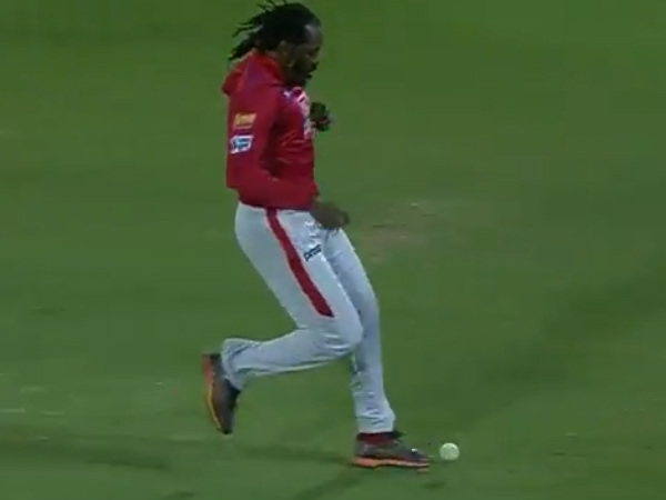 பந்தை பிடிக்க கிறிஸ் கெயில் மிக வேகமாக ஓடி வந்தார். பவுண்டரி எல்லைக்கு சில அடி தூரம் முன்பு பந்துக்கு அருகே வந்தார் கெயில். எப்படியும் பந்தை பிடித்து விடுவார் என பார்த்தால், காலால் பந்தை தடுக்க முயன்றார் கெயில்.