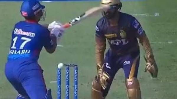 வருண் சக்கரவர்த்தி கீழாக போட்ட அந்த பந்தை ஓங்கி அடிக்க முயன்ற ரிஷப் பண்ட், பந்தை தொடக்கூட முடியாமல் தவறவிட்டார். எனவே தவறிய பந்தை மீண்டும் அடிப்பதாக விளையாட்டுத் தனமாக பேட்டை சுழற்ற, அது பின்னால் நின்றுக் கொண்டிருந்த தினேஷ் கார்த்திக்கின் ஹெல்மட்டை பதம் பார்த்திருக்கும். நூலிழையில் தினேஷ் கார்த்திக் அங்கு தப்பித்தார்.