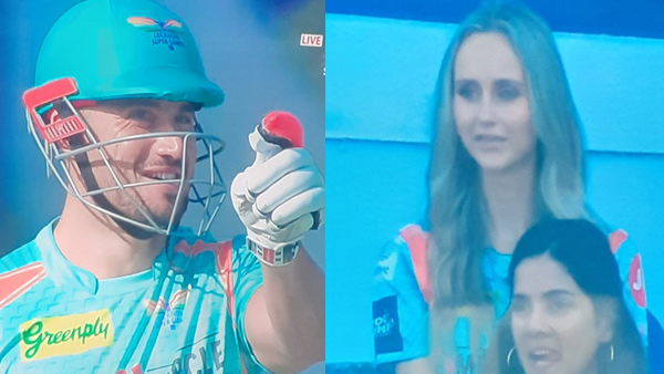 சிக்ஸர் அடித்த பிறகு சிரித்தப்படியே வந்த ஸ்டோய்னிஸ், கே.எல்.ராகுலிடம் மைதானத்தின் ஏதோ ஒரு பகுதியை காட்டி பேசிக்கொண்டிருந்தார். அப்படி என்ன பார்க்கிறார் என்று பார்த்தால், எதிரில் ஸ்டோய்னிஸின் மனைவி உற்சாகமாக போட்டியை பார்த்து வந்துள்ளார். மனைவிக்கு அற்பணிப்பதற்காக தான் தனது முதல் சிக்ஸரை அவ்வளவு வேகத்துடன் பறக்கவிட்டுள்ளார். இதுகுறித்த வீடியோ வேகமாக பரவி வருகிறது.