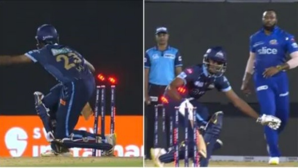 16வது ஓவரை பொல்லார்ட் வீச, 2வது பந்து ஸ்லோ பாலாக போடப்பட்டது. அதனை சாய் சுதர்சன் சிக்ஸர் அடித்தார். இதனையடுத்து அவரின் ஆர்வத்தை பார்த்த பொல்லார்ட் மீண்டும் கடைசி பந்தை ஷார்ட் பாலாகவும், ஸ்லோவராகவும் வீசினார். இந்த முறை அதிர்ஷ்டவசமாக பந்தை அடிக்க தவறிவிட்டார். ஆனால் பேட்டை சுழற்றிய வேகத்தில் ஸ்டம்பில் பட்டு ஹிட் விக்கெட்டாகி வெளியேறினார்.