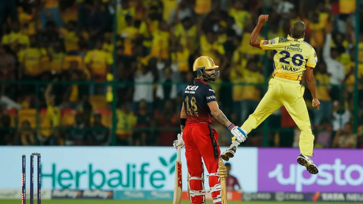 பெங்களூரு: சென்னை அணிக்கு எதிரான போட்டியில் ஆர்சிபி அணியின் நட்சத்திர வீரர் விராட் கோலியை 6 ரன்களில் வீழ்த்தி இம்பேக்ட் பிளேயராக வந்த ஆகாஷ் சிங் முதல் ஓவரிலேயே வீழ்த்தி அசத்தியுள்ளார்.