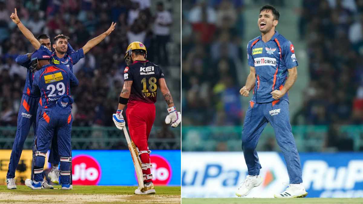 4 ஓவர்கள் வீசிய லக்னோ அணியின் இளம் சுழற்பந்துவீச்சாளர் ரவி பிஷ்னாய் 21 ரன்கள் மட்டுமே விட்டுக்கொடுத்து 2 விக்கெட்டுகளை வீழ்த்தியுள்ளார். குறிப்பாக ரவி பிஷ்னாய் 5.2 எகனாமியில் மட்டுமே பந்துவீசியுள்ளார். ரவி பிஷ்னாயின் பந்துவீச்சால் ஆர்சிபி அணி டாப் ஆர்டர் மொத்தமாக கலங்கி போனது. இதனால் பெங்களூரு அணியின் ரசிகர்கள் சோகத்தில் உள்ளனர்.