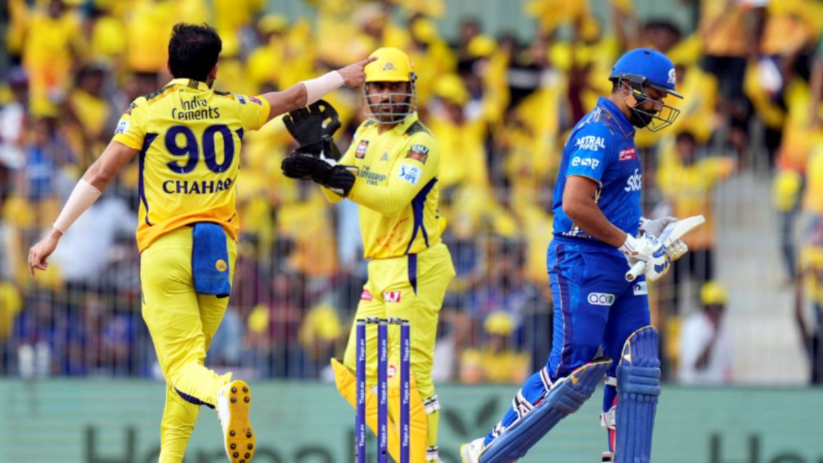 இதனைத் தொடர்ந்து வழக்கம் போல் அல்லாமல் ரோகித் சர்மா மூன்றாவது வீரராக களமிறங்கினார். தொடக்க வீரராக வந்த கேமரூன் க்ரீன் 6 ரன்களில் ஆட்டமிழந்ததால், ரோகித் சர்மா மீதான அழுத்தமும் அதிகரித்தது. இதையடுத்து சென்னை அணியின் கேப்டன் எம்எஸ் தோனியின் ப்புதிய யுக்தியால் ரோகித் சர்மா ஸ்கூப் ஷாட் ஆட முயன்று டக் அவுட்டாகி ஆட்டமிழந்தார்.