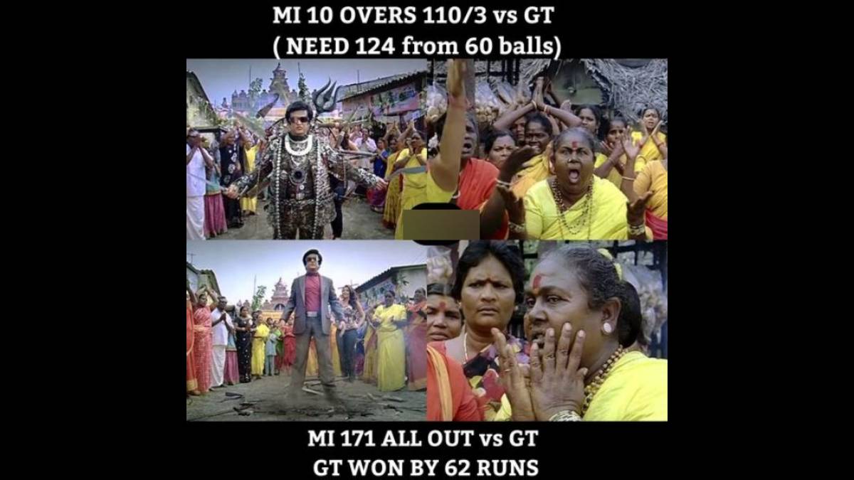இதுவரை பிளே ஆப்பில் எந்த அணியும் 200க்கும் அதிகமான ரன்களை சேஸ் செய்து வென்றதில்லை. நேற்று குஜராத் அணி 234 ரன்களை இலக்காக நிர்ணயித்தது. இதையடுத்து சேஸ் செய்த மும்பை அணி 171 ரன்களுக்கு ஆல் அவுட்டாகியது. இதனால் மும்பை அணி ஐபிஎல் தொடரில் இருந்து வெளியேறியது. இதனை யாரடி நீ மோகினி படத்தில் வரும் ரகுவரன், தனுஷிடம், "நீ இவ்வளவு தூரம் வந்ததே பெருசு" என்று சொல்லுவார். அதனை மாற்றி, "இந்த பவுலிங் யூனிட் வச்சுட்டு இவ்ளோ தூரம் வந்ததே பெருசு" என்று சொல்வதாக உருவாக்கப்பட்டுள்ள மீம் ரசிகர்களுக்கு ஆறுதல்.