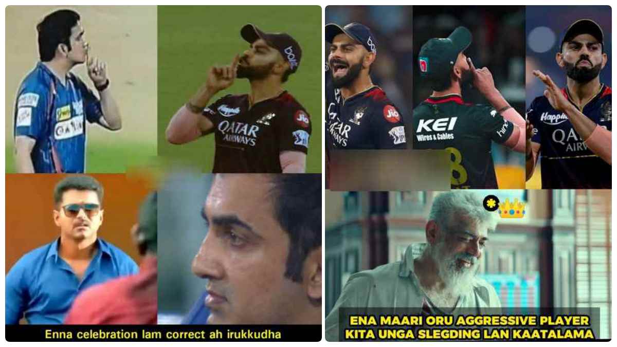 நேற்றைய ஆட்டத்தில் விராட் கோலி ஆக்ரோஷம் 10 மடங்கு அதிகமாக இருந்தது. லக்னோ வீரர்களே ஏன் இப்படி அதிகமாக கொண்டாடுகிறீர்கள் என்று கேட்கும் அளவிற்கு விராட் கோலி தனியாளாக மைதானத்தை ஆக்ரமித்து கொண்டிருந்தார். அதனை துணிவு படத்தில் வரும் அஜித், "என்ன மாதிரி அய்யோக்கிய பய மேல கைய வைக்கலாமா" என்று வசனம் பேசுவார். அதனை மாற்றி, "என்ன மாதிரி ஒரு அக்ரஸிவ் பிளேயர் கிட்ட உங்க ஸ்லெட்ஜிங்க காட்டலாமா" என்று கேட்பது போல் உருவாக்கப்பட்டுள்ள மீம் மரண மாஸ்.