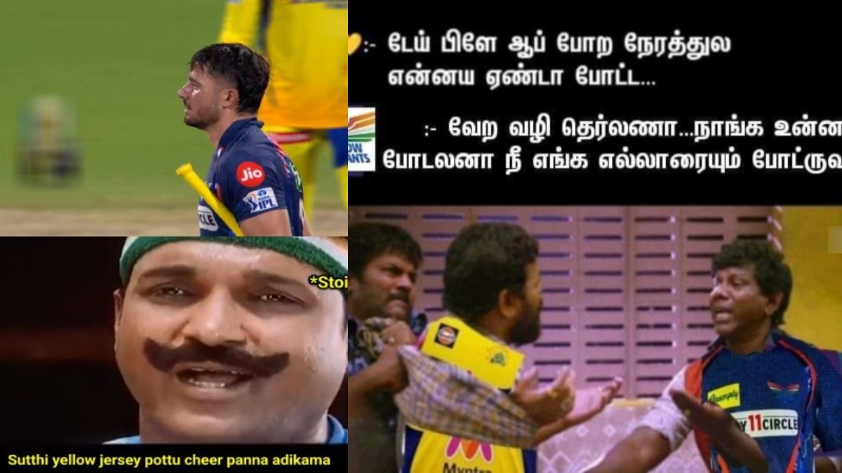 கில்லி படத்தில், "மீனாட்சியம்மன் கோயில் முன்னாடி மதுர முத்துப்பாண்டியவே அடிச்சிட்டான்.. யாருனே இவன்.. சத்தியமா சொல்றேன் மதுரக்காரனா மட்டுமே இருக்க மாட்டேன்" என்று ஒரு வசனம் வரும். அதில் சேற்றில் விழுந்த பிரகாஷ்ராஜை சிஎஸ்கே அணியாக மாற்றி, முத்துப்பாண்டிய அவன் கோட்டைலயே அடிச்சிட்டாங்க லக்னோ என்று உருவாக்கப்பட்டுள்ள மீம் மரண மாஸ்.