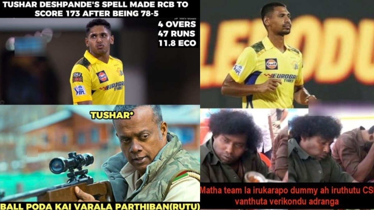 நேற்றைய ஆட்டத்தில் சிஎஸ்கே பவுலர் துஷார் தேஷ்பாண்டே 4 ஓவர்களில் 47 ரன்கள் விட்டுக் கொடுத்து, ஆர்சிபி அணி 173 ரன்கள் குவிக்க முக்கிய காரணமாக அமைந்தார். லியோ படத்தில் ஹைனா ஊருக்குள் புகுந்த போது அதனை தடுக்க விஜய் முயற்சிப்பார். அப்போது ஹைனாவை விஜய் திசை திருப்பிய போது, ஒரு முனையில் இருந்து கவுதம் மேனனை மயக்க ஊசியை துப்பாக்கி மூலம் செலுத்த அறிவுறுத்துவார். ஆனால் சரியாக அந்த நேரத்தில் துப்பாக்கி செயல்படாமல் போகும். அப்போது அவர், "துப்பாக்கி வேலை செய்யலை பார்த்திபன்" என்று கூறுவார். அதனை அப்படியே துஷார் தேஷ்பாண்டே சொல்வதாக மாற்றி, "பால் போட கை வரலை ருதுராஜ்" என்று உருவாக்கப்பட்டுள்ள மீம் குபீர் ரகம்.