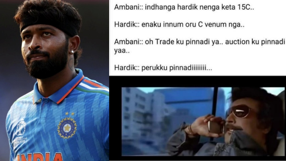 அதில் ஹர்திக் பாண்டியா மும்பை அணிக்கு திரும்ப ரூ.15 கோடியை அம்பானி தரப்பில் வழங்கப்பட, அதற்கு ஹர்திக் பாண்டியா, எனக்கு இன்னொரு C வேணும் என்கிறார். அதற்கு அம்பானி, ஓ.. டிரேட்-க்கு பின்னாடியா.. மினி ஏலத்திற்கு பின்னாடியா.. என்று மறுகேள்வி கேட்கிறார். அதற்கு ஹர்திக் பாண்டியா, பேருக்கு பின்னாடி என்று பதில் அளிப்பது போல் உருவாக்கப்பட்டுள்ளது. இந்த மீம் கிரிக்கெட் ரசிகர்கள் மத்தியில் அதிகமாக பகிரப்பட்டு வருகிறது.