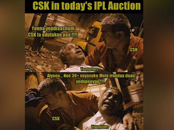 அதுபோல் சென்னை அணியில் வயதான நபர்கள் மட்டும் எடுக்கப்படுகிறார்கள். இதை வைத்து ''நீ வயசானஆட்களை மட்டும் தான எடுப்ப'' என இளம் வீரர்கள் கேட்பது போல இவர்போட்டு இருக்கிறார்.