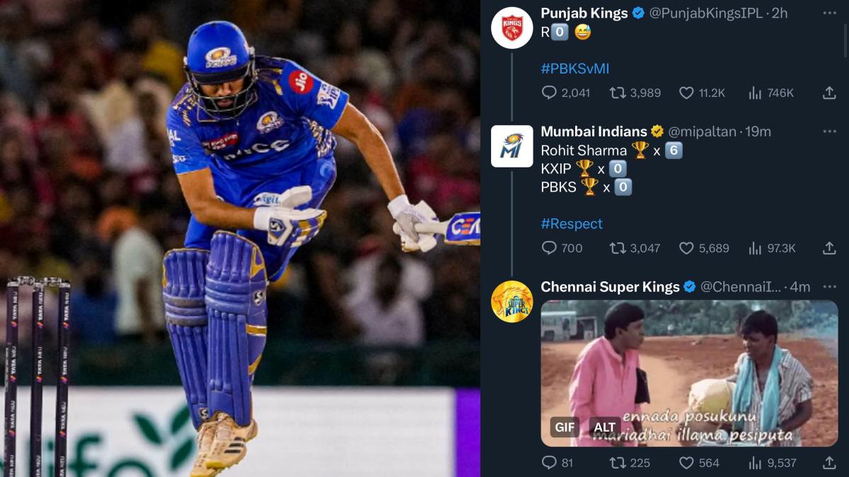அப்போது ஆர்ஸ்தீப் சிங் வீசிய பந்தில் ஸ்டம்ப் உடைந்தது. இதனை கிண்டல் செய்யும் விதமாக மும்பை காவல்துறையை டேக் செய்து பஞ்சாப் அணி கிண்டல் செய்தனர். இந்த நிலையில் நேற்று நடைபெற்ற ஆட்டத்தில் ரோகித் சர்மா டக்அவுட் ஆனார். இதனை கேலி செய்த பஞ்சாப் அணி ட்விட்டர் பக்கத்தில் ரோகித் சர்மாவை அவமதிக்கும் வகையில் ஆர் ஓ ஜீரோ என பதிவிட்டு கேலியாக சிரிக்கும் ஸ்மைலியை போட்டு இருந்தார்கள்.