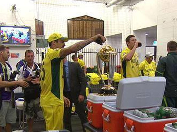 அதில் டிரஸ்ஸிங் ரூமில் ஆஸ்திரேலிய வீரர்கள் ஆங்காங்கே உள்ளனர். மிட்சல் ஜான்சன், ஒரு குளிர்பான பெட்டி மீது உலகக் கோப்பையை வைத்து அதற்கு முன்பு நிற்கிறார். அவரது கையில் மது பாட்டில் போல உள்ளது. பீர் பாட்டில் போலத் தெரிகிறது. அதை எடுத்து உலகக் கோப்பை மீது ஊற்றி சிரித்தபடி அதை ரசிக்கிறார் ஜான்சன்.