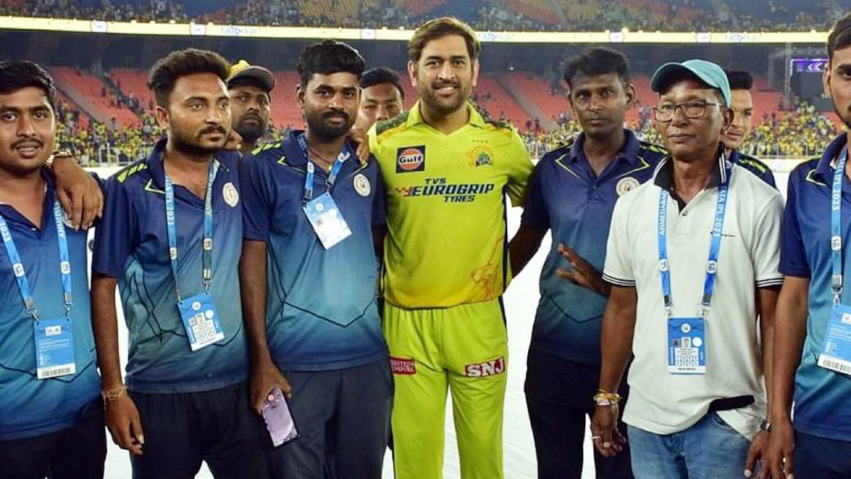 ஆனால் அதற்கு தோனி எதுவும் சொல்லாமல் அனைவருடன் மகிழ்ச்சியாக நின்று புகைப்படம் எடுத்துக் கொண்டார். இதனை பார்த்த ரசிகர்கள் நெகழ்ச்சி அடைந்தனர். இந்தப் போட்டி நடக்க காரணமாக இருந்த மைதான பராமரிப்பாளர்களை அனைவரும் மறந்த நிலையில் தோனி மட்டும் அவர்களுடன் புகைப்படம் எடுத்துக் கொண்டு உரிய அங்கீகாரத்தை வழங்கி இருப்பதாக ரசிகர்கள் பாராட்டியுள்ளனர்.
