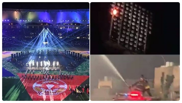 தொடக்க விழா என்பதால் பிரமாண்ட முறையில் வாண வேடிக்கை நிகழ்ச்சிகள் நடத்தப்பட்டன. அப்போது பட்டாசுகளை சரியாக கையாளததால் திடீரென மைதானத்தின் மின் விளக்குகள் மீது மோதி தீ பற்றி எறிந்தது. முதலில் சிறிய வெளிச்சம் போன்று இருந்ததை ரசிகர்களும், மைதான ஊழியர்களும் சகஜமாக எடுத்துக்கொண்டனர். ஆனால் பின்னர் தீ பரவத்தொடங்கியதால் பரபரப்பு ஏற்பட்டது.