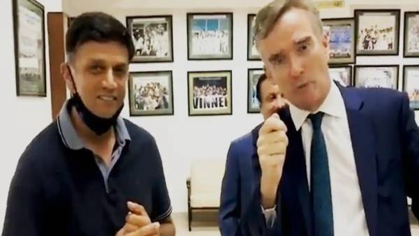 இப்படி அவரைப் பற்றி பேச வேண்டிய விஷயங்கள் நிறைய உள்ளன. விரைவில் ரவி சாஸ்திரியின் ஒப்பந்த காலம் முடிவடைவதால், ராகுல் டிராவிட் இந்திய அணியின் பயிற்சியாளராகக் கூட வாய்ப்பிருக்கிறது. (ஆனால் அதற்கு விராட் கோலி மனது வைக்க வேண்டும் என்பது வேறு விஷயம்). இந்நிலையில், இந்தியாவுக்கான இங்கிலாந்து உயர் தூதரக அதிகாரி வெளியிட்ட வீடியோ ஒன்று அதிகம் பகிரப்பட்டு வருகிறது. அதாவது, இந்தியாவுக்கான இங்கிலாந்து உயர் தூதரக அதிகாரி அலெக்ஸ் எல்லிஸ் தனது ட்விட்டரில் தான் டிராவிட்டிடம் கன்னட மொழி உச்சரிக்க கற்றுக் கொள்ளும் வீடியோவை வெளியிட்டுள்ளார். 'Indian cricket expression' நிகழ்வு என்ற குறிப்பிட்டு அவர் டிராவிட்டிடம் கன்னடம் பேச கற்கும் வீடியோவை வெளியிட்டுள்ளார்.