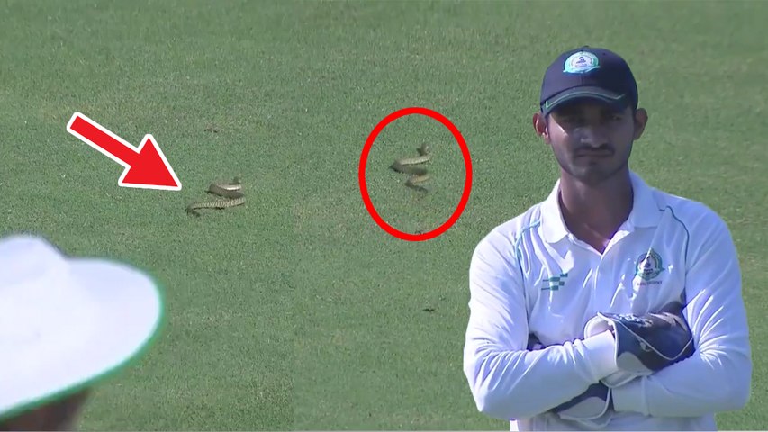 அங்கும் இங்கும் சென்ற பாம்பால் வீரர்கள் பதற்றம் அடைந்தனர். இதனிடையே, பாம்பு குறித்த இந்த விடியோ பிசிசிஐ உள்நாட்டு டிவிட்டரில் பகிரப்பட்டது.