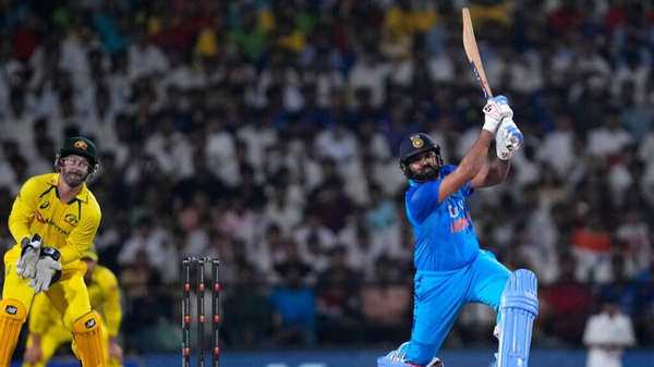இதனை அடுத்து களமிறங்கிய இந்திய அணி ஆரம்பம் முதல் அதிரடியை காட்டியது முதல் ஓவரிலேயே 20 ரன்கள் குவிக்கப்பட்டது. கேப்டன் ரோஹித் சர்மா பட்டையை கிளப்பி 4 பவுண்டரிகள் நான்கு சிக்ஸர்கள் விளாசி 20 பந்துகளில் 46 ரன்கள் குவித்தார் .இதன் மூலம் சர்வதேச டி20 போட்டியில் அதிக சிக்சர் விளாசிய வீரர் என்ற பெருமையை ரோகித் சர்மா பெற்றார்.
