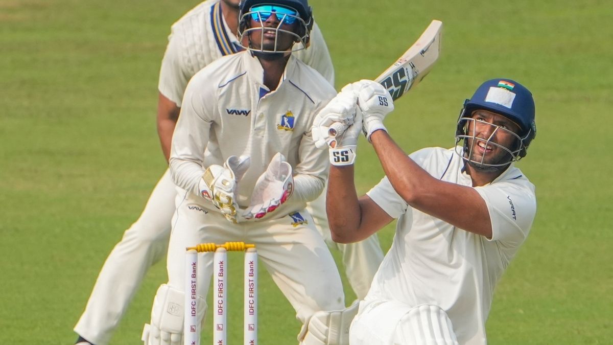 வெறும் 62 பந்துகளைச் சந்தித்து, தனது சதத்தை எட்டி, தேர்வுக்குழுவினரைத் திரும்பிப் பார்க்க வைத்தார் சிவம் துபே. ராஜ்வர்தன் ஹங்கர்கேகர் வீசிய 39-வது ஓவரின் முதல் பந்தில் பவுண்டரி அடித்து, தனது சதத்தைப் பதிவு செய்தார். சதமடித்த அடுத்த பந்திலேயே, அவர் கேட்ச் கொடுத்து ஆட்டமிழந்தார். அவர் 63 பந்துகளில் 100 ரன்கள் குவித்து வெளியேறினார்.