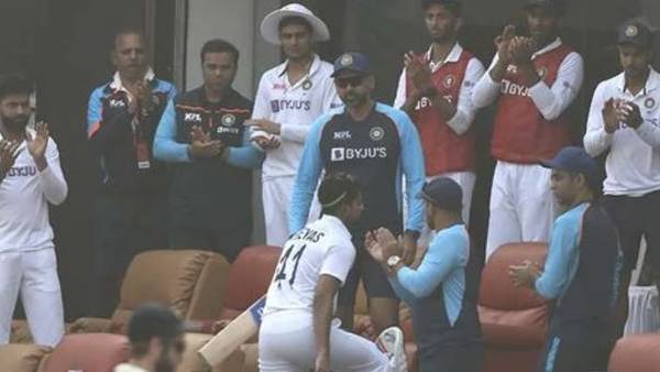 அதாவது அறிமுக டெஸ்ட் போட்டியிலேயே சதம் மற்றும் அரை சதம் அடித்த முதல் இந்திய வீரர் என்ற பெருமை அவரை சென்றடைந்தது. இந்நிலையில் இந்த சாதனைகாக ஸ்ரேயாஸுக்கு கொடுக்கப்பட்ட மரியாதை வைரலாகி வருகிறது. 2வது இன்னிங்ஸில் அவுட்டாகி அவர் பெவிலியன் திரும்பும்போது அணி வீரர்கள் மட்டுமின்றி டிராவிட் உள்ளிட்ட பயிற்சியாளர்கள், சப்போர்ட் ஸ்டாப், இந்திய அணி நிர்வாகிகள் என அனைவரும் எழுந்து நின்று அவருக்கு கைதட்டி உற்சாக வரவேற்பு கொடுத்தனர்.