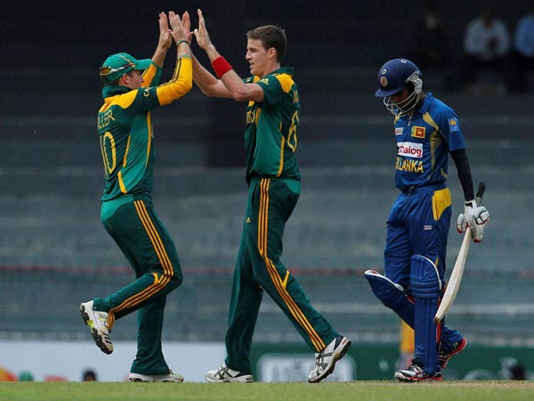 பின்னர் ஆடிய இலங்கை அணி தொடக்க வீரர்கள் அடுத்தடுத்து வீழ்ந்தனர். இந்த தடுமாற்றம் கடைசிவரை நீடித்தது. இலங்கை அணியின் திசரா பெரேரா மட்டுமே வெளுத்து வாங்கிக் கட்டினார். அவர் 49 பந்துகளில் 65 ரன்களைக் குவித்தார். அதுவும் தென்னாப்பிரிக்காவின் பீட்டர்சனி ஒரே ஓவரில் 5 சிக்சர் ஒரு பவுண்டரி விளாசியிருந்தார் பெரேரா. அத்துடன் ஒரு வைடும் வீச ஒரே ஓவரில் 35 ரன்கள் கிடைத்தது. ஆனாலும் திசர பெரேராவின் இந்த ஆட்டம் கை கொடுக்கவில்லை.