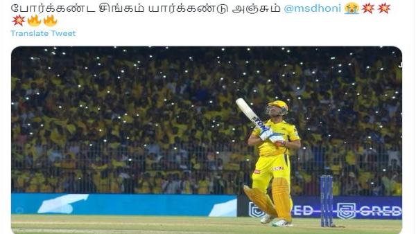 140 கி.மீ.-க்கும் அதீத வேகத்தில் வந்த இரு பந்துகளை தோனி சிக்சர்களாக மாற்றியது சென்னை ரசிகர்களிடையே உற்சாகத்தை ஏற்படுத்தியது. தோனி சிக்சர் அடித்ததைத் தொடர்ந்து சமூக வலைதளங்களில் ரசிகர்கள் அடுத்தடுத்து மீம்ஸ்களை வெளியிட்டு கொண்டாட்டத்தை வெளிப்படுத்து வருகின்றனர். அந்த மீம்ஸ்களில் சில டாப் மீம்ஸ்களை பார்க்கலாம். அதில் எம்.எஸ்.தோனி சிக்சர்கள் விளாசிய புகைப்படத்தை பகிர்ந்து, "போர்க்கண்ட சிங்கம் யார்க்கண்டு அஞ்சும்" விக்ரம் படத்தில் வரும் பாடலை குறிப்பிட்டு நெகிழ்ந்துள்ளனர்.