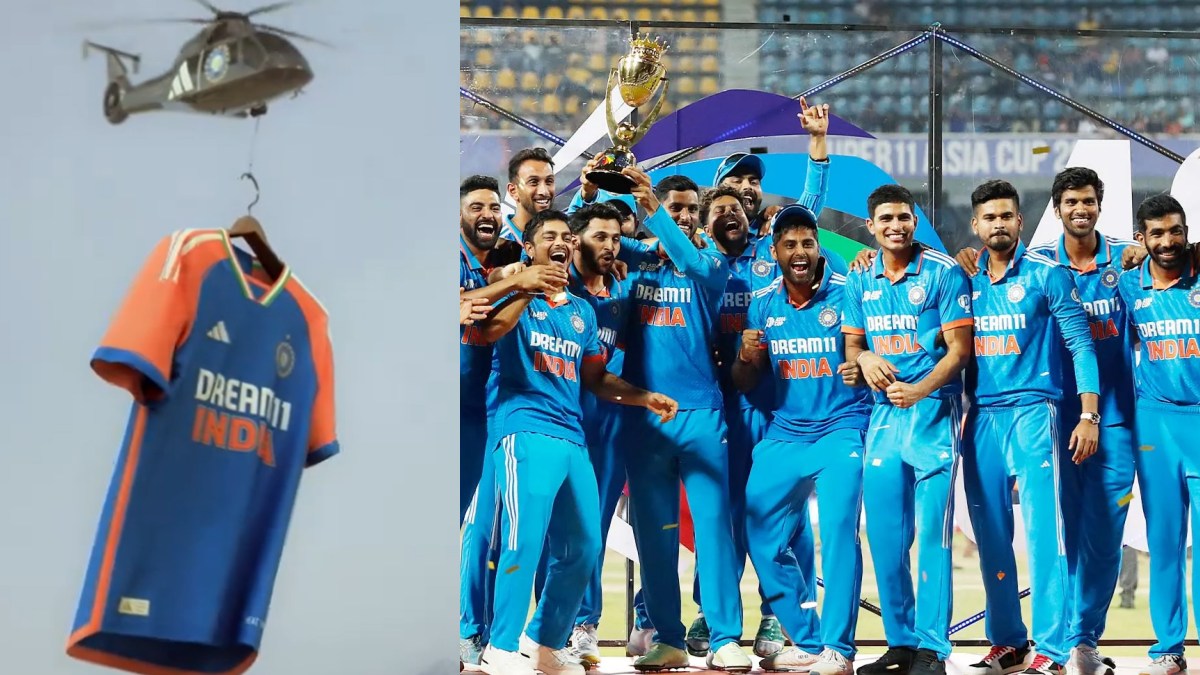 ஹெலிகாப்டர் மூலமாக அறிமுகம் செய்யப்பட்ட ஜெர்ஸி வீடியோ சோசியல் மீடியாவில் ட்ரெண்டாகியுள்ளது. இந்த ஜெர்ஸியில் வழக்கத்திற்கு மாறாக நீல நிறத்திற்கு பதிலாக காவி நிறம் அதிகரிக்கப்பட்டுள்ளது. இதற்கு முன் இந்திய அணியின் டி20 ஜெர்ஸியில் காவி நிறமே இடம்பெறவில்லை. அதற்கு பதிலாக வெள்ளை நிறமே இருந்தது. தற்போது வெள்ளை நிறத்தை குறைத்து காவி நிறம் அதிகரிக்கப்பட்டுள்ளது. ஏற்கனவே இந்திய அணியின் பயிற்சி ஆடை முழுவதும் காவி நிறமாக மாற்றப்பட்டது.