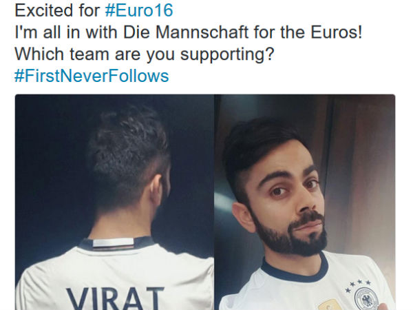 இதுகுறித்து அவர் போட்டுள்ள டிவிட்டில், யூரோஸ் போட்டிகளில் நான் ஜெர்மனியுடன் இருக்கிறேன். நீங்கள் யாரை சப்போர்ட் செய்கிறீர்கள் என்று கேட்டுள்ளார் கோஹ்லி.