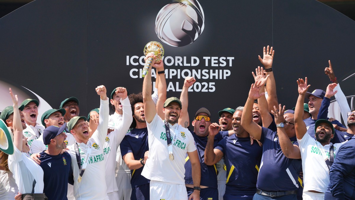 லண்டன்: உலக டெஸ்ட் சாம்பியன்ஷிப் பட்டத்தை தென்னாப்பிரிக்க வென்றதும், அந்த அணியின் வீரர்கள் லண்டன் லார்ர்ட்ஸ் பால்கனியில் குதித்து கொண்டாடினர். அதன் பிறகு, வீரர்கள் அனைவரும் மைதானத்திற்குள் வந்து கொண்டாடினர்.
